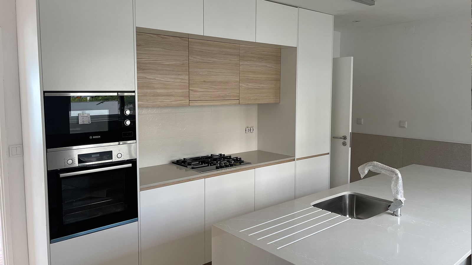 O projeto da cozinha foi concebido com um layout espaçoso para permitir uma circulação confortável e facilitar o trabalho na área de preparação e cozimento dos alimentos.